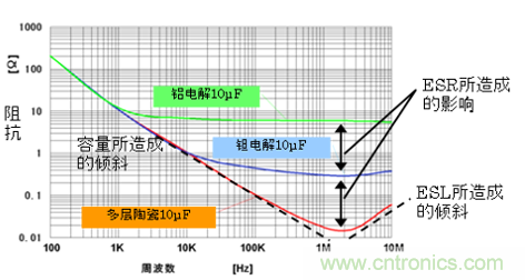 多層陶瓷電容器具有良好的高頻特性。與其他電容器相比,由于其具備能夠減小電阻及殘余電感的構造,因此在高頻條件下也能保證 電容器的工作。圖3、圖4所示為等效電路與電感的特性。由于鋁電解電容器及鉭電解電容器的ESR較高,因此阻抗也就較高。但陶瓷電容器卻是頻率越高則阻抗 越低,這對于去藕來說非常有效,并能夠發揮高性能的濾波能力。