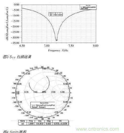圖4顯示,在頻率為7.2 GHz時,天線的歸一化阻抗為(0.977 5 + 0.037 9i)Ω ,這個結果顯示出此時天線達到了很好的阻抗匹配狀態。