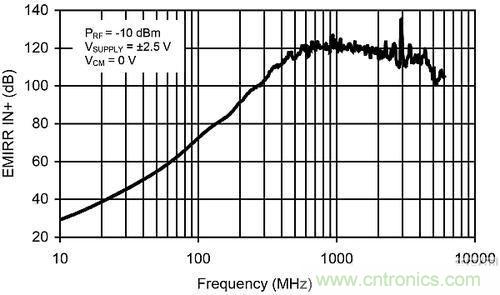 EMIRR曲線展示了運(yùn)放被傳導(dǎo)的抗RF信號(hào)(該信號(hào)被應(yīng)用到非反相輸入端)干擾能力的測定值。術(shù)語“被傳導(dǎo)”是指該RF信號(hào)被直接應(yīng)用到使用阻抗匹配型印刷電路板(PCB)的運(yùn)放輸入端。此外,還對放大器輸入端的反射進(jìn)行了表征和說明。