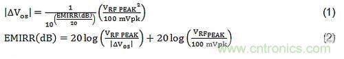 方程式(1)和(2)給出了EMIRR的數(shù)學(xué)定義。兩個(gè)方程式互為彼此的重置版本。方程式(1)展示了所用RF信號(hào)和偏移電壓的改變之間的關(guān)系。請注意所用RF信號(hào)的平方引起的偏移電壓變化。這意味著入射RF信號(hào)較小幅度的增加可導(dǎo)致偏移電壓的顯著增加。還請注意,術(shù)語EMIRR的作用是減弱RF信號(hào)的影響;換句話說,較大的EMIRR(dB)可使偏移電壓的變化大幅度減少。方程式(2)是在表征過程中用來計(jì)算EMIRR(dB)的方程形式。