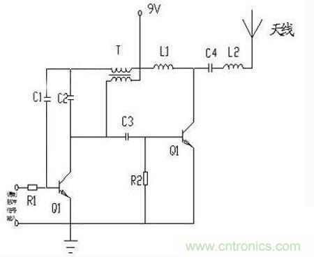 如圖所示是無線發射器原理電路圖,Q1是共發射極變壓器耦合振蕩電路:負載是變壓器T的衩級線圈,集電極輸出信號經T耦合后,由次極經C1送基極,構成正反饋,起振。基極同時送入低頻調制信號,對產生的高頻振蕩進行幅度調制。