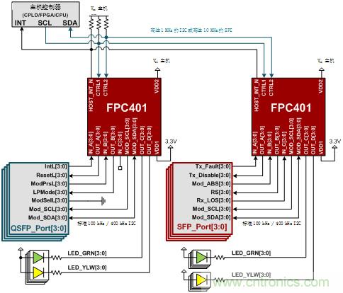FPC401將多達56個端口的所有低速信號集成到單個快速I2C總線(高達1MHz)或串行外設接口(SPI)總線(高達10 MHz)中,大大降低了線路復雜性并簡化了設計可擴展性。FPC401四個端口中的每一個端口都具有三個輸入、四個輸出和一個I2C主機,從而實現對下游模塊的完全控制。有關SFP和QSFP連接的示例,請參見圖2。