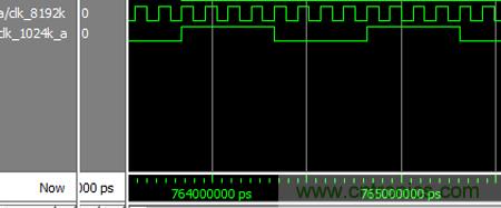根據(jù)所需的時鐘頻率為1024kHz的時鐘,而晶振時鐘的頻率為8192kHz,晶振時鐘與所需的時鐘頻率恰巧是8倍的整數(shù)倍關系,因此需要對8192kHz的晶振時鐘進行8分頻來獲得所需要的時鐘。根據(jù)整數(shù)倍分頻器的設計方法原理,通過ISE9.1邏輯設計工具,利用VHDL硬件描述語言來進行8分頻的分頻器設計。然而8又是偶數(shù),所以需要設計的是偶數(shù)分頻器。對設計的內容通過Modelsim6.5仿真軟件進行仿真驗證,結果如圖3-1所示。