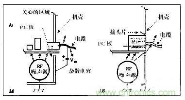 使共模電流注入到I/O區的另一機理,是附近有強的干擾源的耦合。甚至有些“屏蔽”連接器也無用,因為干擾源就在連接器附近,如PC機環境。如果在連接器和底板之間有一個缺口,此處所感應的RF電壓可以使EMC性能下降(圖1B)。