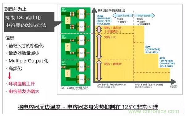 但是,近年來隨著Multiple-Output化(Tx增加)加速,一方面元件數量增加,而由于基站尺寸小型化,散熱器等散熱對策可用的空間越來越少。使用頻帶的進一度高頻化,元件發(fā)熱進一步增大,將電容器周邊溫度和自身發(fā)熱抑制在125℃,在電路設計上的制約案例中變得尤為顯著。