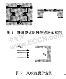硅薄膜式測風傳感器的設計示意圖如圖1所示。薄膜式風速風向傳感器主要是利用風吹薄膜對薄膜產生風壓,風壓導致薄膜形變,薄膜上的應變電阻就會感應到薄膜的形變。通過測量應變電阻的變化即可解算出風速大小。設定測量時風正面吹向薄膜如圖2所示。