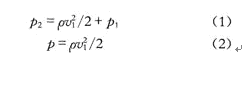圖2中:υ1表示風的平均流速;p1表示風流的壓力;p2表示薄膜所受的壓力,應用流體力學中理想伯努力方程如式(1)。其中p為空氣的密度,化簡后可以得出薄膜承受絕對壓強p的變化與風速的關系如式(2),即