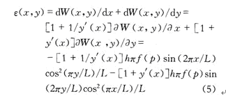 p是作用在膜上的絕對壓強;E和υ分別為薄膜材料的楊氏模量和泊松比。材料的形變定義為單位長度材料的變化。設ε(x,y)是薄膜的應變函數,可以用式(5)來計算,則