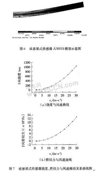 把模擬所得的數據進行分析,可知懸梁撓度、剪圖7切力都與風速成二次關系,與懸梁式傳感器理論分析相一致。