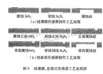 兩種傳感器擬采用基于MEMS的體硅工藝,應用正背面異向濕法刻蝕和背面深刻蝕形成薄膜或懸梁。薄膜設計為10μm厚,200 μm×2000 μm的正方形;懸梁設計為10μm厚,1500 μm長,500 μm寬。采用雙面拋光n型(76 mm)100硅片厚度350 μm。硅片清洗后,用熱氧化工藝制作一層氧化硅,再用LPCVD工藝制作一層氮化硅;之后濺射Pt電極,采用lift-off工藝去掉不需要的Pt金屬。完成以上步驟后,薄膜式傳感器直接在背面腐蝕形成薄膜,完成傳感器的制作;懸梁式傳感器需要先在正面腐蝕出10μm的深坑,后在背面先濕法腐蝕5 h深度達到200μm,再深刻蝕直到出現圖形。其過程如圖8。