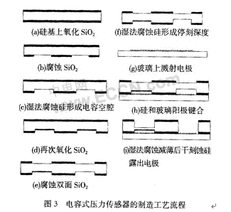 整個(gè)制造流程都采用標(biāo)準(zhǔn)工藝,如圖3所示。先熱氧化100 nm的SiO2,既作為腐蝕Si的掩膜,又作為電容兩電極的絕緣層。利用各向異性腐蝕形成電容空腔和將來露電極的停刻槽,如果硅片厚度一致且KOH腐蝕速率均勻,此法可以在相當(dāng)程度上等效于自停止腐蝕。從玻璃上引出電容兩電極,然后和硅片進(jìn)行陽極鍵合。鍵合片利用KOH腐蝕減薄后反應(yīng)離子深刻蝕露出測(cè)量電極。