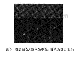 目前真空腔的形成多采用Si—Si鍵合或者陽極鍵合。本方案采用陽極鍵合,是因?yàn)殛枠O鍵合比Si—Si鍵合的要求低。首先溫度只需要400~500℃,其次表面光潔度要求也相對(duì)較低。本工藝過程中存在金屬電極,不適于用高溫;鍵合面存在高約1400 nm,寬為20μm的電極引線,鍵合面的SiO2經(jīng)過一定程度的KOH各向異性腐蝕后粗糙度為100nm左右,經(jīng)過試驗(yàn)證明,鍵合情況良好(圖5),并具有良好的密封效果。