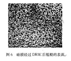 反應(yīng)離子深刻蝕(DRIE)能刻出非常深的垂直結(jié)構(gòu),本試驗(yàn)用于最后硅薄膜的形成。DRIE的刻蝕效果(刻深為250 μm)沒有KOH腐蝕的平坦,刻蝕表面比較粗糙,表面顆粒起伏為幾個(gè)微米,如圖6。此外刻蝕存在不均勻性,75 mm硅片四周已經(jīng)刻到電極露出,而硅片中央的電極還沒有露出。深刻蝕的不均勻性與刻蝕表面的圖形有著密切的聯(lián)系,但其中的成因和機(jī)理目前還沒有具體合理的理論和解釋說明。因而無法從理論上指導(dǎo)規(guī)劃刻蝕表面的形狀設(shè)計(jì),更多的是依靠經(jīng)驗(yàn)手動(dòng)凋整。