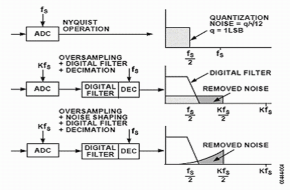 圖4.過取樣、數字濾波、噪聲整形和采樣抽取對噪聲頻譜的影響