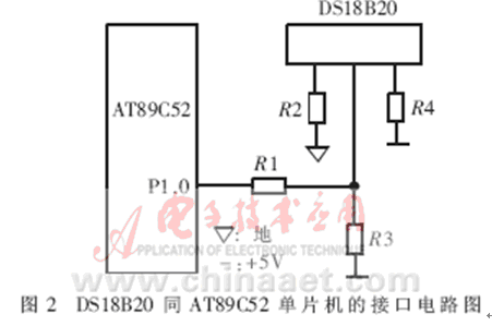 DS18B20的測溫原理為:內(nèi)部計(jì)數(shù)器對(duì)一個(gè)受溫度影響的振蕩器的脈沖計(jì)數(shù),低溫時(shí)振蕩器的脈沖可以通過門電路,而當(dāng)?shù)竭_(dá)某一設(shè)置高溫時(shí),振蕩器的脈沖無法通過門電路。計(jì)數(shù)器設(shè)置為-55℃時(shí)的值,如果計(jì)數(shù)器到達(dá)0之前門電路未關(guān)閉,則溫度寄存器的值將增加,這表示當(dāng)前溫度高于-55℃。同時(shí),計(jì)數(shù)器復(fù)位在當(dāng)前溫度值上,電路對(duì)振蕩器的溫度系數(shù)進(jìn)行補(bǔ)償,計(jì)數(shù)器重新開始計(jì)數(shù)直到回零。如果門電路仍然未關(guān)閉,則重復(fù)以上過程。溫度轉(zhuǎn)換所需時(shí)間不超過750ms,得到的溫度值的位數(shù)因分辨率不同而不同[2]。DS18B20同AT89C52單片機(jī)的接口電路如圖2所示。這種接口方式只需占用單片機(jī)一根口線,與智能儀器或智能測控系統(tǒng)中的其它單片機(jī)或DSP的接口也可采用類似的方式。