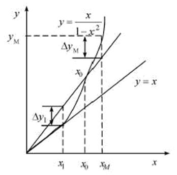 這是電容相對增量與極距相對增量之間的關系方程式。若采用線性特性方程y =x,如圖4所示,顯然其線性誤差較大。為此可采用線性特性方程y=(1+ε)x,并使其在最大量程xM 處產生的正誤差ΔyM 及其x1在處產生的負誤差Δy1在數值上相等,即: