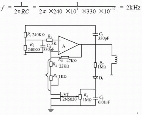 由于放大器的輸出電阻很低,反饋信號加入運算放大的同相輸入端,所以輸入電阻很高,這樣同相放大器的增益KF=1+ R8/Rf,僅與外部電阻R8和Rf有關,而與放大器本身參數無關,因此增益的精度和穩定性都很高。在實際應用中,常選RC串-并聯電路的R1=R2=R,C1=C2=C,所以在f=1/2πRC這個頻率上, RC移相網絡相位移為零,而R8≈2Rf,滿足振蕩條件。選R=240kΩ, C=330pF,則得到振蕩頻率為: