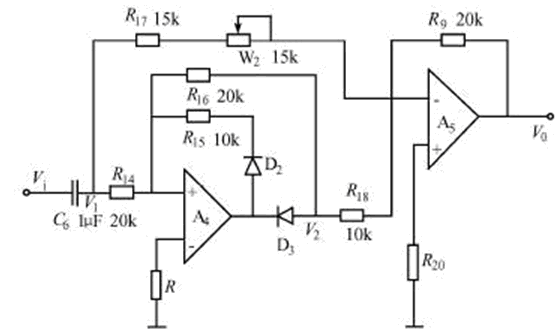當輸入電壓Vi 為正半周期時,經耦合電容C6的電壓V1(即Vi =V1)輸入給A4反相,D2截至,D3導通,A4的電壓放大倍數為R16/R14=-1,即V1=-V2;調整W2,R17=R19=20kΩ ,經R17和W2送來的A5的輸入信號為V1,另一路經A5的輸入信號為V2,則輸出信號為:
