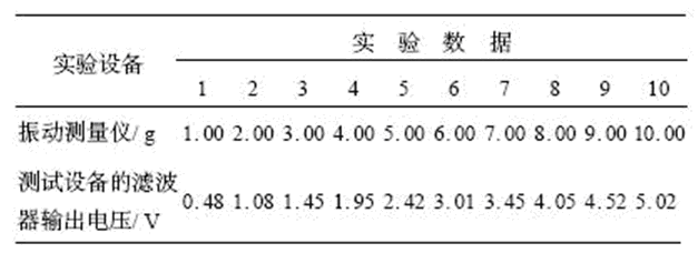 實驗設備:ZD-1型振動臺一臺,其頻響10~20kHz。9102型測振傳感器一個,其性能指標:靈敏度為10pC/ms2,頻響為0.2~6000Hz ,線性度為±1%。BZ2112型振動測量儀, 其性能指標: 頻響為0.5Hz~100kHz ,量程為0.1~1000ms -2(0.01~100g)。被測試設備一臺。實驗時,振動臺工作在300Hz ,通過調節振動臺振動幅值,使振動測量儀工作量程0~100ms -2范圍,分別讀取被測設備輸出電壓數值,對它進行特性分析。測試數據如表1所示: