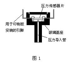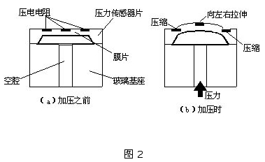 圖1為PS壓力傳感器的截面結構圖,圖2為其傳感器部分的結構。如圖所示,在壓力傳感器半導體硅片上有一層擴散電阻體,如果對這一電阻體施加壓力,由于壓電電阻效應,其電阻值將發生變化。受到應變的部分,即膜片由于容易感壓而變薄,為了減緩來自傳感器底座應力的影響,將壓力傳感器片安裝在玻璃基座上。