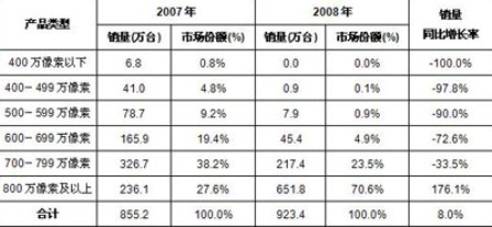 表2 2008年中國(guó)數(shù)碼相機(jī)市場(chǎng)不同產(chǎn)品像素類型銷量及增長(zhǎng)情況