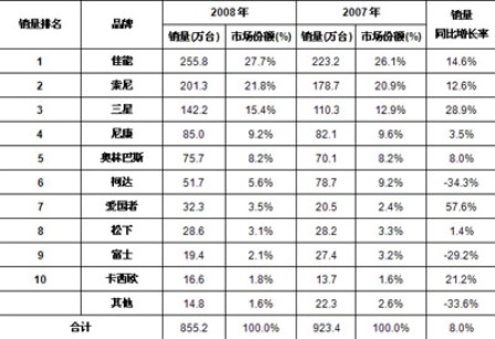 2008年,佳能進(jìn)一步保持并鞏固其銷售量市場(chǎng)第一的領(lǐng)先地位,市場(chǎng)占比達(dá)到27.7%,Sony繼續(xù)保持中國(guó)數(shù)碼相機(jī)市場(chǎng)的第二名的位置,在其突出的產(chǎn)品攻勢(shì)下,市場(chǎng)份額有所上升。三星、尼康和奧林巴斯,分別進(jìn)入中國(guó)數(shù)碼相機(jī)市場(chǎng)的前五名。