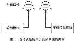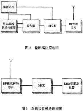 該系統(tǒng)的工作原理如下,把輪胎模塊裝置在輪胎內(nèi),壓力和溫度傳感器檢測輪胎內(nèi)部當(dāng)前的應(yīng)力和溫度信息,獲得的模擬信號經(jīng)過A/D變換器轉(zhuǎn)換成數(shù)字信號,然后通過射頻發(fā)射器發(fā)送出去。車載接收模塊裝置在駕駛室內(nèi),射頻接收器接收來自輪胎模塊的應(yīng)力和溫度信息,當(dāng)輪胎壓力過高或者過低時(shí),通過顯示和報(bào)警裝置發(fā)出報(bào)警信息。