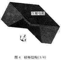 其中,壓阻式壓力傳感器主要是利用半導(dǎo)體的壓阻效應(yīng),把一個惠斯通電橋做在一個硅杯上,如圖4所示。當(dāng)硅杯受到壓力后發(fā)生形變,惠斯通電橋的四個橋臂電阻就會發(fā)生變化,打破了電平衡,從而會有一個電信號的輸出。