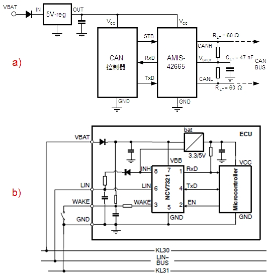 圖3:基于安森美半導體收發器的典型CAN電路(圖a)及LIN電路(圖b)。