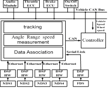 數(shù)據(jù)融合系統(tǒng)采用分布式體系結構,即每個近距離傳感器對獲得的回波信號先進行局部處理,然后送入融合中心進行融合以獲得目標的方位、速度信息。控制器是整個雷達網(wǎng)絡系統(tǒng)的最終決策機構,它負責識別目標的距離和速度信息是否對行車安全構成威脅,并通過聲光的形式提示駕駛員或者直接作用于車載控制系統(tǒng)加以調整。