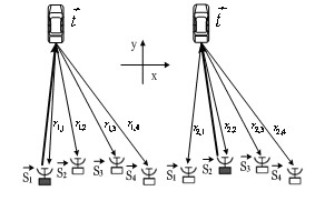 對于本文所討論的雷達網(wǎng)絡系統(tǒng)而言,四個近距離雷達傳感器即是發(fā)射機又是接收機。如圖6所示,通過電掃開關的控制,其中的一個NDS擔當發(fā)射機,反射信號被四個NDS同時接收。經(jīng)過信號處理之后,因各個NDS之間位置的不同,可以得到四組關于被測目標的距離和相對速度值(r1,1v1,1)、(r1,2v1,2)、(r1,3v1,3)、(r1,4v1,4)。這種采用單基地發(fā)射多基地接收的雷達網(wǎng)絡體制,盡管對傳感器之間的時間同步控制要求很高,但是可以避免鄰近傳感器之間的相互干擾。