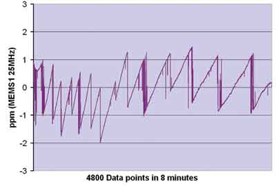 ●MEMS器件顯示了每百萬(wàn)分之幾的階躍變化。這是校正諧振器溫度變化的溫度補(bǔ)償電路的特性。該特性可列成PLL電路中的數(shù)字變化表從而校正頻率。