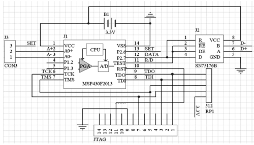 本文介紹的單片傳感信號(hào)接口設(shè)計(jì)采用了德州儀器公司新近推出的一款多功能的微控制器MSP430F2013,它內(nèi)部集成了16位的Σ-ΔADC。2kb的程序空間和128b的數(shù)據(jù)存儲(chǔ)空間,可以完成數(shù)據(jù)的智能采集,并采用差分傳輸方式進(jìn)行數(shù)據(jù)的傳輸。數(shù)據(jù)按幀進(jìn)行傳輸,傳輸過(guò)程中采用CRC檢驗(yàn)進(jìn)行差錯(cuò)控制。