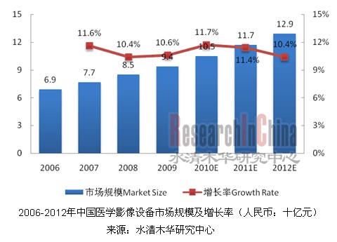 水清木華研究中心指出,近年來(lái),在社會(huì)需求劇增、行業(yè)利潤(rùn)豐厚以及醫(yī)改的背景下,中國(guó)醫(yī)學(xué)影像設(shè)備行業(yè)獲得高度發(fā)展。2006至2009年期間,行業(yè)市場(chǎng)規(guī)模從68.7億元人民幣增長(zhǎng)至94.2億元人民幣,2006-2009年復(fù)合年增長(zhǎng)率為10.9%,預(yù)計(jì)到2012年仍能保持10.4%的增長(zhǎng)速度。