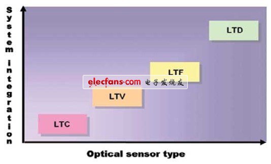 一旦根據轉換類型、速率以及光譜響應縮小了選擇范圍,最后的選擇就要基于其他標準,比如封裝類型、溫度范圍,當然還有成本。典型的工作溫度范圍是商用(0~70℃),工業用(-40~85℃),汽車(-40~105℃)以及軍用(-55~125℃)通常,成本與硅的尺寸成正比。并且,硅基尺寸越大,成本越高。光的應用傾向于更高的系統集成,見圖1,集成度越高,傳感器的復雜度越高,但各部件對應用所起的作用卻越低。