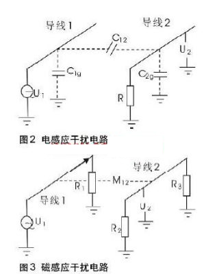 感應干擾分為電感應干擾和磁感應干擾兩種,其基本電路圖如圖2和圖3。U1為導線1的電壓,I1為導線1上電流,U2為導線2上的干擾電壓,C12為兩導線間的電容,C1g和C2g為導線1、導線2與地的電容,M12為兩回路間互感,R為各電路的電阻。
