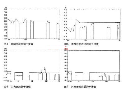 雨刮電機是設備中典型的感性負載干擾源,功率較大,采用零部件測試方式對其測量,先對電機的換向器結構做了調整,并在電機內部對電路做了濾波處理。圖4、圖5是改進前后的結果,射頻段干擾也有明顯改進。