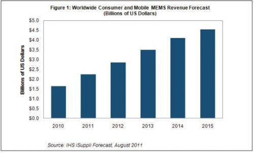據(jù)IHS公司的消費(fèi)與移動(dòng)MEMS市場(chǎng)研究報(bào)告,微機(jī)電系統(tǒng)(MEMS)市場(chǎng)中最大和最有活力的領(lǐng)域是消費(fèi)與移動(dòng)器件,通過積極開拓智能手機(jī)和平板應(yīng)用,2011年MEMS市場(chǎng)將再度實(shí)現(xiàn)創(chuàng)紀(jì)錄的增長(zhǎng)率。