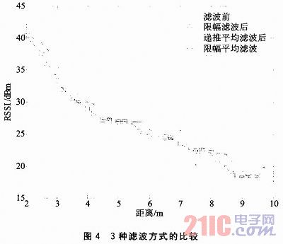 紅外線、GPS和超聲測距都需要額外的硬件,增加了節(jié)點(diǎn)的硬件成本和尺寸。GPS和紅外線測距誤差較大,而利用超聲方法測距很精確,測距誤差只有10 cm,但是受氣溫、濕度等的影響較大,不適合在室外使用。基于RSSI的定位無需額外硬件,利用對(duì)接收無線信號(hào)的強(qiáng)度判斷,推導(dǎo)收發(fā)節(jié)點(diǎn)間的距離,計(jì)算接收無線信號(hào)強(qiáng)度是商用無線收發(fā)芯片具備的功能。基于RSSI的測距提供了最廉價(jià)的定位方法,而且節(jié)點(diǎn)沒有添加任何部件。基于超聲的測距雖然定位精度較高,但是需要添加硬件、增加節(jié)點(diǎn)成本和尺寸。所以,基于RSSI的測距是無線傳感器網(wǎng)絡(luò)定位較常采用的方法。首先對(duì)RSSI進(jìn)行預(yù)處理,再通過預(yù)測模型預(yù)測距離的值,不但提高了基于RSSI的測距精度,而且實(shí)現(xiàn)了低成本的測距。