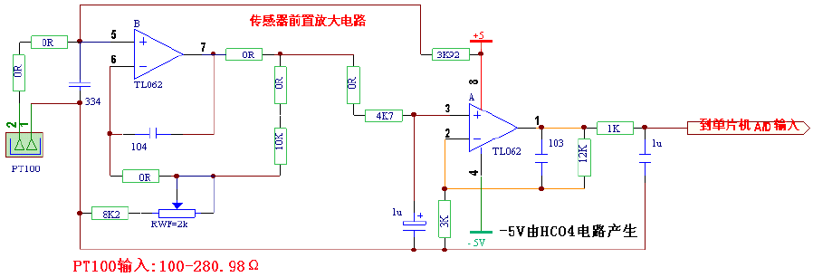 傳感器的接入非常簡單,從系統(tǒng)的 5V 供電端僅僅通過一支 3K92 的電阻就連接到 PT100 了.這種接法通常會引起嚴重的非線性問題,但是.由于有了單片機的軟件校正作為后盾,因此就簡化了傳感器的接入方式.