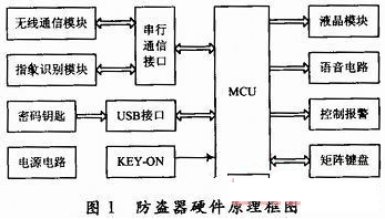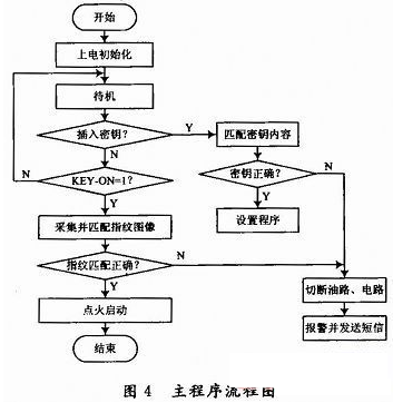 主要工作原理如下:車主停車熄火后,防盜器進入鎖定狀態(tài)。此時如果汽車鑰匙不在ON位,就不能進行指紋識別;只有當汽車鑰匙在ON位,才可用指紋識別解鎖防盜器并自動點火。在鎖定狀態(tài)下,汽車的油路、電路等被切斷,汽車鑰匙無法點火;如果強行剪斷指紋采集模塊和控制盒的連線,或者不識別指紋而強行用汽車鑰匙點火,汽車會通過鳴號、閃燈和無線通信網(wǎng)絡(luò)報警。在鎖定狀態(tài)插入密碼鑰匙可進入解鎖狀態(tài),并可根據(jù)LCD和語音提示通過小鍵盤進行指紋注冊/刪除、手機號碼設(shè)置和應(yīng)急點火等操作。