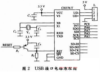 USB接口電路主要由文件管理控制芯片CH376T實現(xiàn),CH376T支持USB設(shè)備方式和USB主機方式,并且內(nèi)置了USB通信協(xié)議的基本固件、處理MassStorage海量存儲設(shè)備的專用通信協(xié)議的固件、SD卡的通信接口固件、FAT16和FAT32以及FAT12文件系統(tǒng)的管理固件,支持常用的USB存儲設(shè)備和SD卡。CH376T支持二種通信接口:SPI接口和異步串口。本設(shè)計采用SPI接口與MCU進行數(shù)據(jù)通信,電路連接方式如圖2所示。串行數(shù)據(jù)輸入SDI、輸出SDO和時鐘SCK分別接STM32F103VC的SPI1_MOSI,SPI1_MISO和SPI1_SCK,中斷請求輸出端INT接PC0,片選端SCS由PA1控制。圖2中的RESET是系統(tǒng)復位信號,晶體振蕩器Y1選12 MHz。當車主要進行指紋注冊/刪除或應(yīng)急點火時,將密碼鑰匙(U盤)接入J1以讀取密碼信息。