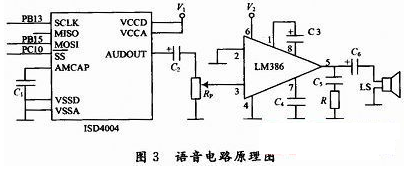 語音電路原理圖如圖3所示,由美國ISD公司的語音芯片ISD4004-16和美國國家半導體公司的音頻功率放大器LM386等元件構(gòu)成。ISD4004 -16錄放時間為16 min(可分段),它采用CMOS技術(shù),單電源3 V工作,內(nèi)含振蕩器、抗混疊濾波器、平滑濾波器、音頻放大器、自動靜噪及高密度多電平閃爍存貯陳列。它內(nèi)置微控制器SPI總線串行通信接口。可將模擬語音數(shù)據(jù)直接寫入單個存儲單元,不需通過A/D或D/A轉(zhuǎn)換。使得ISD語音電路具有音質(zhì)自然、使用方便、單片存儲、反復錄放、低功耗、抗斷電等許多優(yōu)點。LM386工作電壓范圍寬,電壓增益可調(diào)。具有自身功耗低、電壓增益可調(diào)整電源電壓范圍大、外接元件少和總諧波失真小等特點。本設(shè)計中STM32F103VC通過SPI2給ISD4004傳送語音信息。圖3中的V1和V2分別經(jīng)三極管與+3.3 V和+12 V電源相連,三極管的通斷由STM32F103VC的PCI1和PCI2控制,只有在需要語音提示時,才使三極管導通給ISD4004和LM386供電。