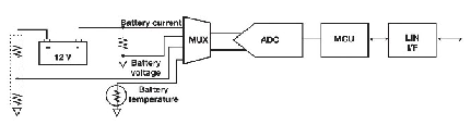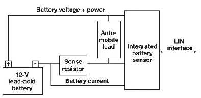 電池電壓通過(guò)一個(gè)直接從電池正極分接出來(lái)的阻性衰減器來(lái)檢測(cè)。為檢測(cè)電流,將一個(gè)檢測(cè)電阻(12V應(yīng)用一般使用100mΩ)放在電池負(fù)極與地之間。在這種配置中,汽車的金屬底盤(pán)一般為地,檢測(cè)電阻安裝在電池的電流回路中。在其它配置中,電池的負(fù)極是地。對(duì)于SoH 計(jì)算,還必須檢測(cè)電池的溫度。