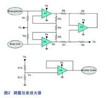 正如上述所說,ECG的信號(hào)路徑必須能調(diào)理不同來源的噪聲。對(duì)抗直流電噪聲,可以使用高通濾波器。然而,最令人頭痛的是50Hz的噪聲,因?yàn)樗鼊偤门c我們收集的信號(hào)頻率處于相同范圍。要消除這個(gè)共模噪聲,需要建立一個(gè)測(cè)量?jī)x表放大器。這個(gè)配置之所以很理想是因?yàn)樗稍谝种乒材k妷旱耐瑫r(shí)放大有用的差分信號(hào),這利于把微弱的有效信號(hào)從背景噪聲中分隔出來。正如圖2所示,這個(gè)儀表放大器是用LMP2234(四通道、微功率、高精度的RRO運(yùn)算放大器)和高精度的電阻器(0.1%)實(shí)現(xiàn)出來。