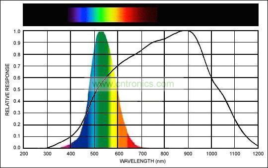 這里還存在一個更細微的問題。具體而言,理想情況下,應確保環境光的測量模擬了人眼對光線的響應機制。這通常借助CIE提供的視覺亮度曲線(圖3)。然而,光電二極管很少能夠完全模擬這種響應機制,因為它們通常具有很高的紅外(IR)靈敏度。在IR強度較大的光照條件(譬如白熾燈或日光)下,這種紅外靈敏度會造成錯誤地判斷光線強度。