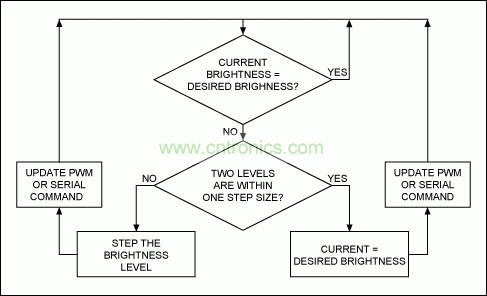 最好不要從一個亮度級直接跳轉到另一個亮度級,而是平滑上調和下調背光亮度,確保不同亮度等級之間無縫過渡。為了達到這一目的,最好采用帶有固定或不同亮度步長、可逐步調節亮度的定時中斷,也可采用帶有可控制LED輸入電流的PWM值的定時中斷,或者是能夠發送到顯示屏控制器的串行指令的定時中斷。圖8提供了這種算法的一個示例。
