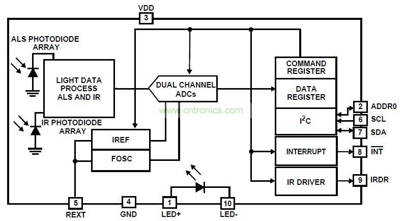 ISL29043是一款帶有I2C(兼容SMBus)接口的集成紅外LED的環境光和接近檢測三合一數字輸出傳感器。該芯片內部集成兩個獨立的ADC,并行進行環境光和接近檢測。靈活的中斷設置可盡可能少的占用微控制器上的資源。
