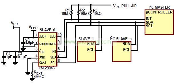 ISL29043工作電壓范圍從2.25V到3.63V,可工作于-40°C至85°C的環境溫度范圍。