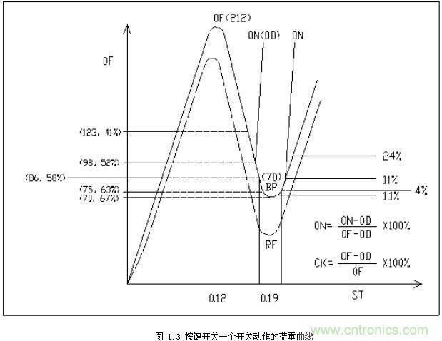 工作原理:薄膜按鍵上的金屬彈片位于FPC(軟性線路板)板上的導電部位(大部分位于線路板上的金手指上方),當受到按壓時,彈片的中心點下凹,接觸到PCB上的線路,從而形成回路,電流通過,整個產品就得以正常工作。按鍵開關從按下去到復位,這個過程也叫一個開關動作,會產生如圖 3所示的曲線,圖1.3是按鍵開關一個開關動作的荷重曲線圖,X軸為行程,單位mm;Y軸為感應力,單位g。圖中有兩個極值點,一個極大值OF,一個極小值OD,這兩個值作為判斷按鍵開關質量好壞的重要參數。